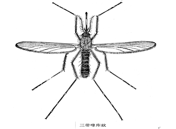 中華按蚊:翅前緣有兩個白斑,腹部無鱗有毛,觸角與喙約等長。(前緣脈有二個白斑,翅后緣縱脈5.2處有一個緣纓白斑,前和中足基節(jié)外側(cè)有白鱗簇)...2015-06-19
